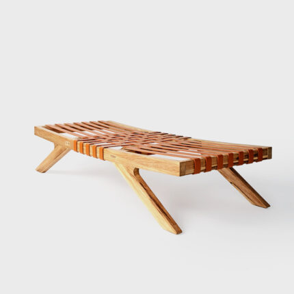seat: leather straps and hand-stitched cushions in natural rustic linen