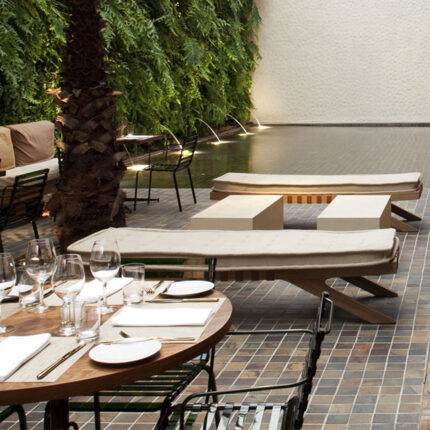 mies is a tropical homage to the iconic barcelona stool by mies van der rohe. created by arthur casas for the former kaa restaurant in são paulo, the stool echoes the x-shaped structure of the barcelona when viewed from the front. in this version, stainless steel and leather are replaced by solid wood and rustic linen, both crafted by hand.