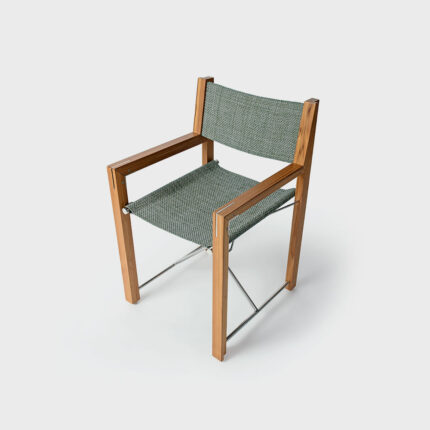 inspired by the traditional “director’s chair,” this model stands out for its thoughtful details. the ergonomics were reimagined by architect arthur casas in collaboration with the nani chinellato team and studio objeto. foldable and suitable for outdoor use, the chair is made from treated wood. stainless steel, also resistant to weather conditions, is used for the joints, ensuring stability. the acqua mesh adds flexibility. this material is handcrafted on a manual loom with an italian weave, made from high-quality composite plastic threads, featuring UV protection to prevent fading and low elasticity—meaning minimal deformation over time.