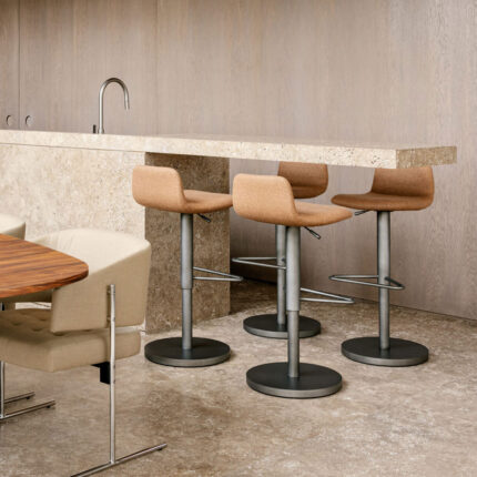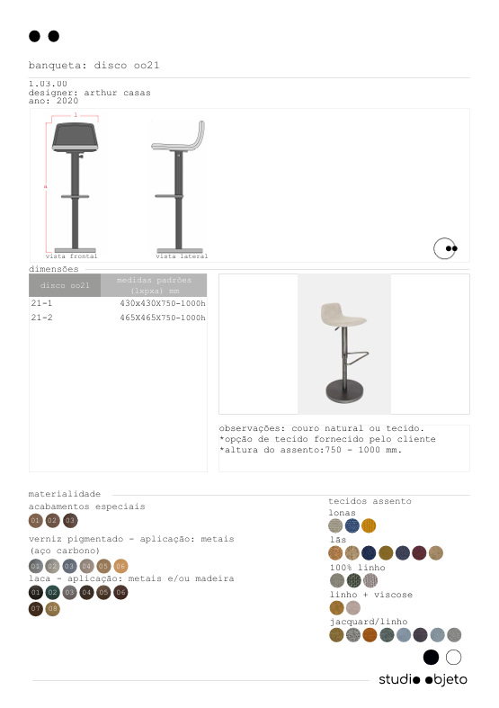 the disco stool was designed by arthur casas as a continuation of other pieces created to meet the needs of hotels and restaurants—items that are not easily found in the brazilian market. it features a low backrest for lumbar support and a gas-lift seat adjustable from 58 to 82 cm in height. the piece offers a combination of comfort, practicality, and durability.