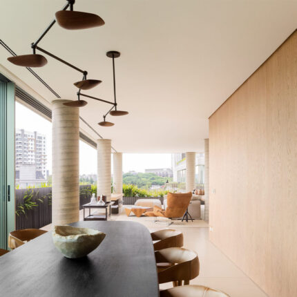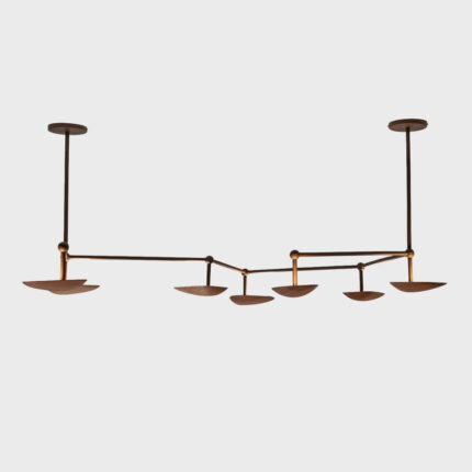 “amorphous” is the name given to forms that are undefined or non-fixed. in this ceiling light, the wooden shades have amorphous shapes, and the concept also extends to the whole piece. all rods are articulated, allowing for different compositions to suit the space. the light emitted from the shades is diffused and indirect—subtle like candlelight—creating an intimate atmosphere.
