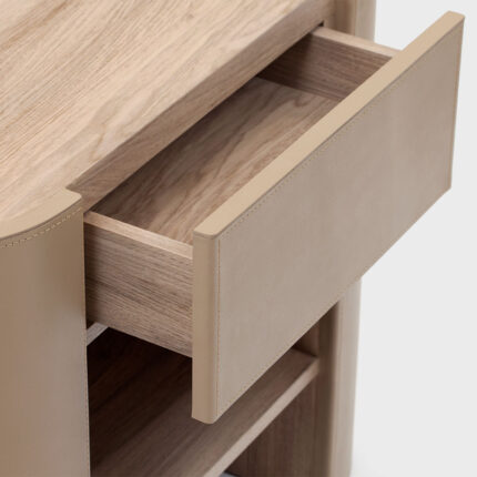 the wooden structure is hand-covered in natural soleta, a thick leather that gains texture and character over time. handcrafted by our leather artisans.