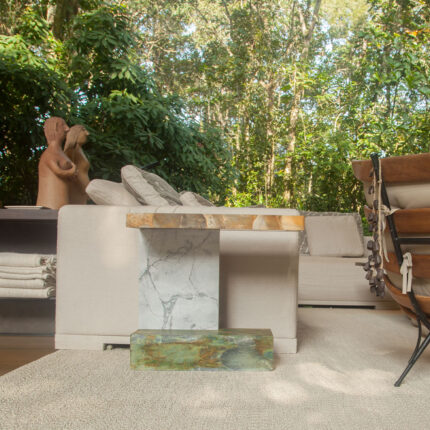 via appia: a sedimentary quartzite conglomerate from goiás, featuring predominantly amber tones. the rounded shape of its pebbles is the result of millions of years of water erosion. this stone is exclusive to arthur casas’ furniture.
