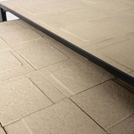 this piece was born from a ceramic tile designed by architect arthur casas. when the first tiles were ready, we assembled a horizontal mosaic—at that moment, what was initially intended as a wall covering was framed and transformed into a table. the ceramic tile features a detailed relief and is crafted through a meticulous handmade process, with a matte sand-toned finish. the slender galvanized steel frame ensures the mosaic top remains the focal point.